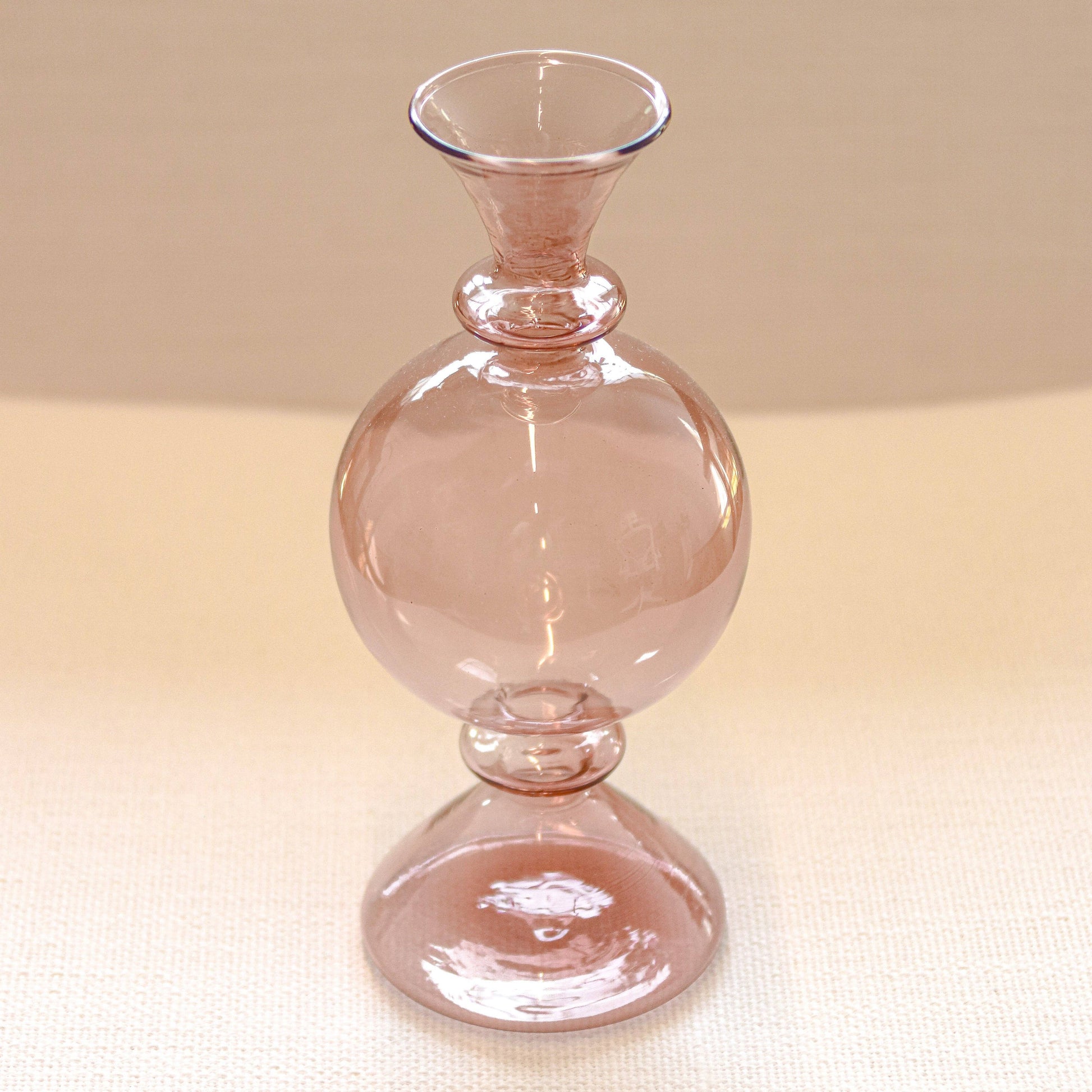 This vase is crafted from translucent glass with a mauve hue. It has a narrower neck and a flared top, reminiscent of a dated perfume bottle or decanter. The vase is ideal for showcasing a single stem or a petite arrangement. SIZE: 7"H x 3.5"W