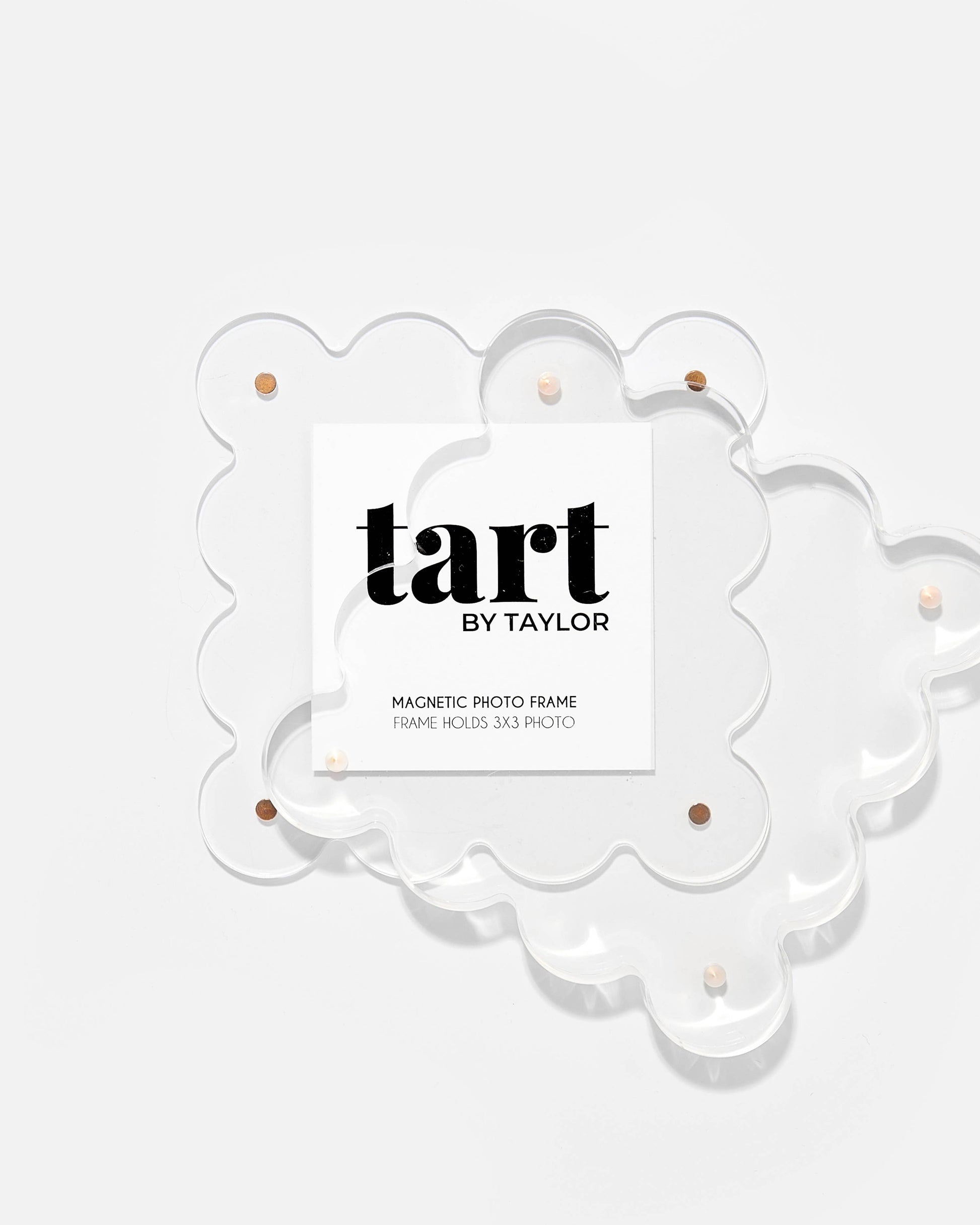 Show off your memories in a unique way with this Clear Mini Acrylic Picture Frame. The acrylic scalloped frame adds a playful touch to your photos, making them stand out in any room. Great for nightstands, and desks plus they make for the perfect gift! Frame Size: 5'' L x 5'' W x 1'' D Frame holds up to a 4'' x 4'' photo; Self-standing photo frame, can stand vertically or horizontally. Two acrylic panels simply attach together using four industrial strength magnets. Made of acrylic. Use a soft damp cloth to clean.