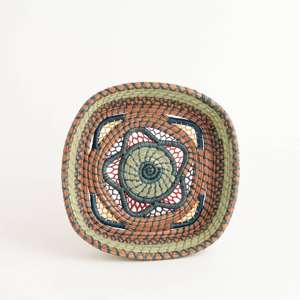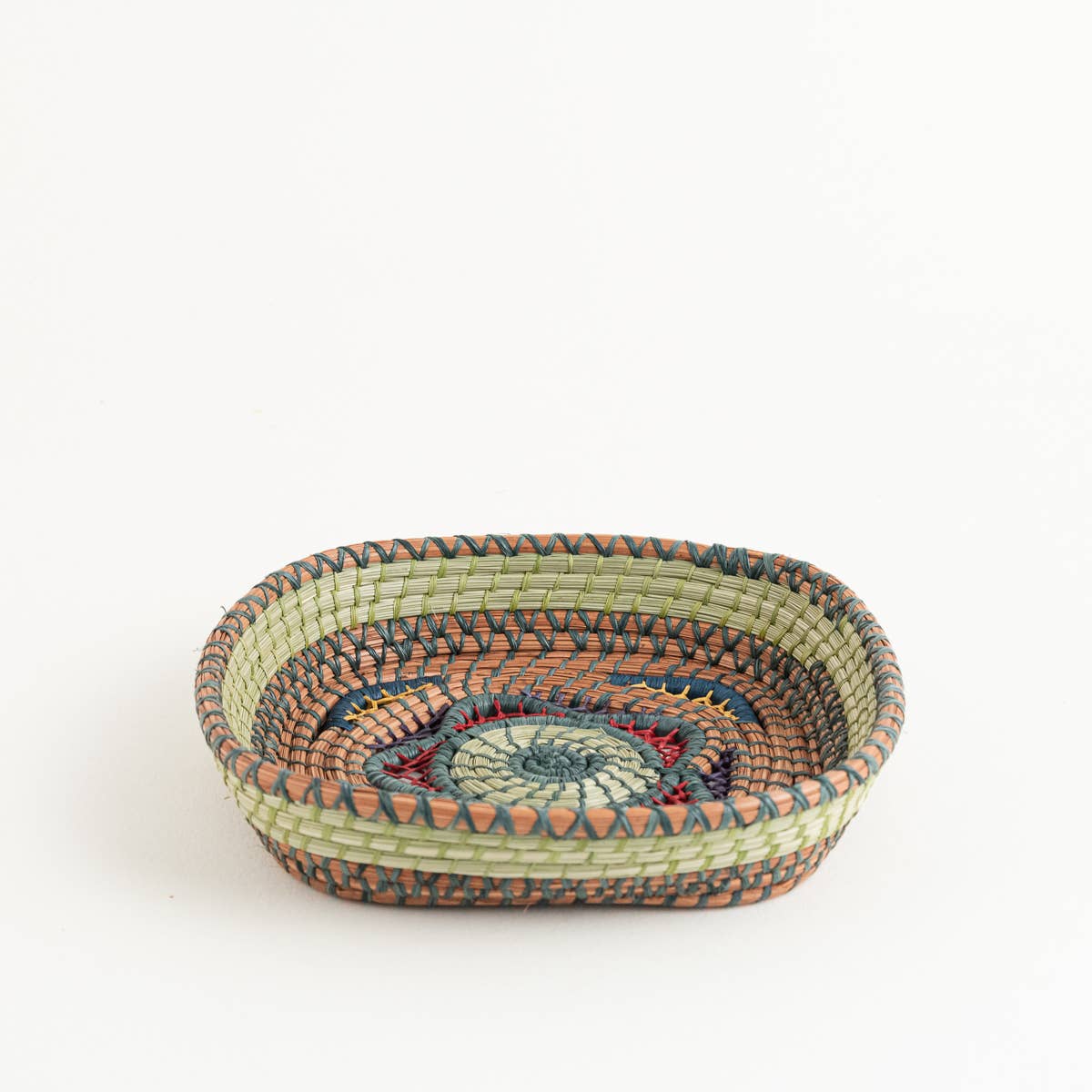 The Estrella Basket is intricately woven of pajon, a native wild grass, and pine needles with colorful raffia accents. This handmade sturdy basket may be decorative, but it's entirely functional too. Approximately 7"W x 1.5"H