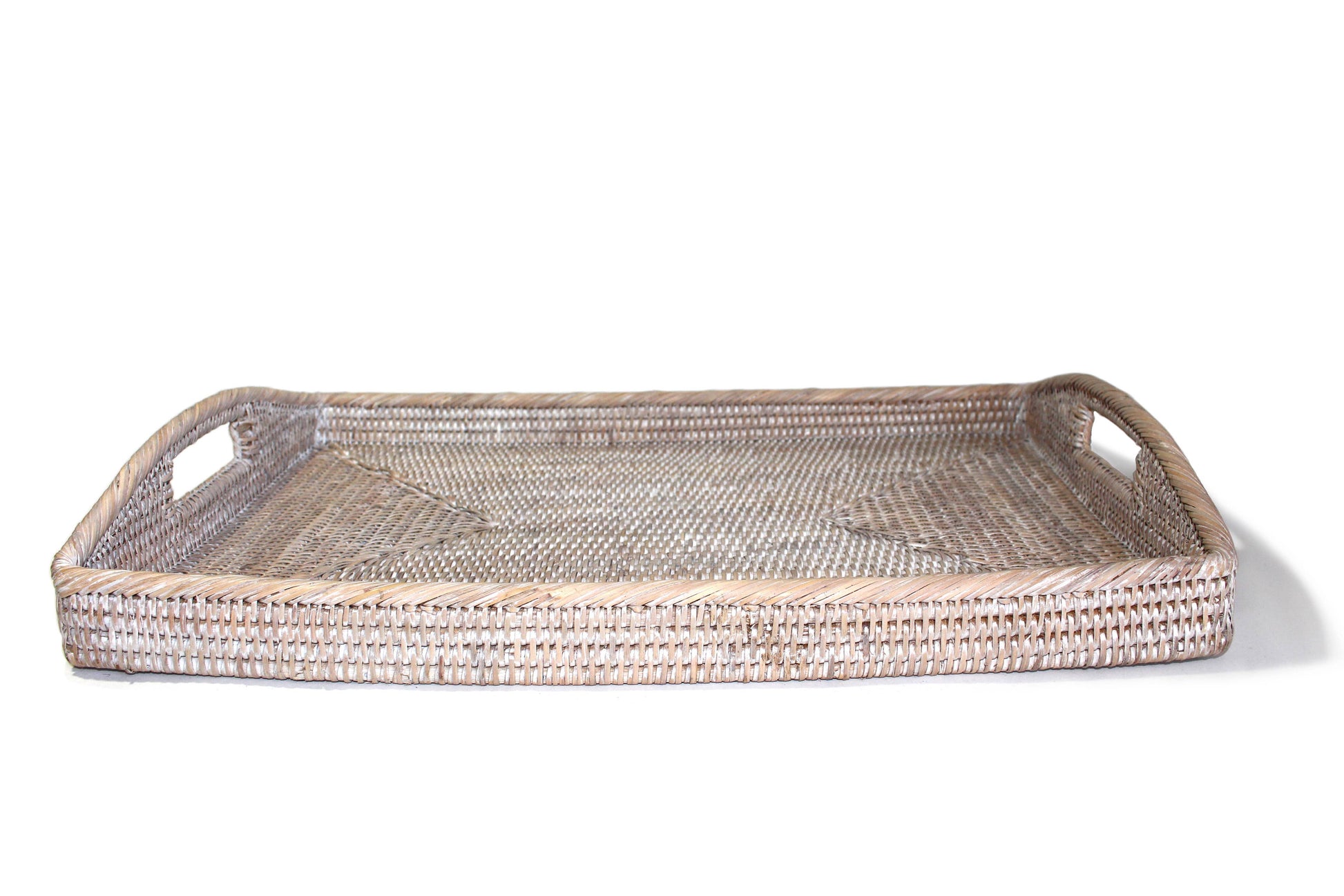 Large rectangular whitewashed rattan tray. Size: 20.5"W x 13.5"D x3.5"H